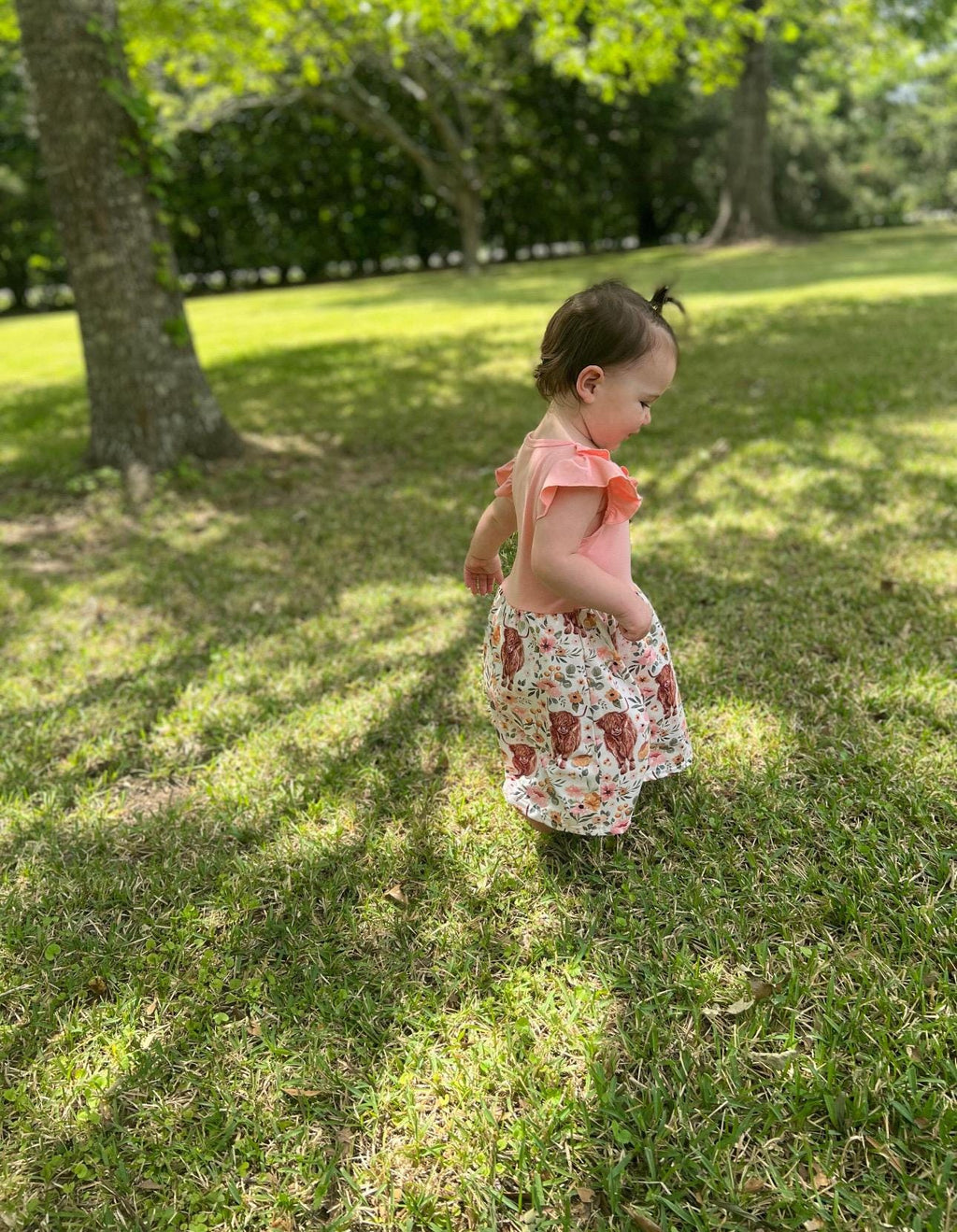 This Scottish Highland Cow Dress is one of those easy throw-on-and-go pieces that still makes a statement. The soft solid top features sweet flutter sleeves, a collar neckline, and button detail — paired with the most adorable floral Highland cow print skirt.