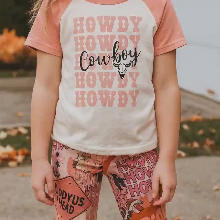 💕 Absolutely adore this Howdy Cowboy Bell Bottom Outfit! Perfect for your lil cowgirl, this set combines Western charm with stylish flair. Featuring a fun and comfy baseball-style t-shirt and adorable pink bell-bottom pants with a charming Western print, it’s a must-have for Western-loving girls!