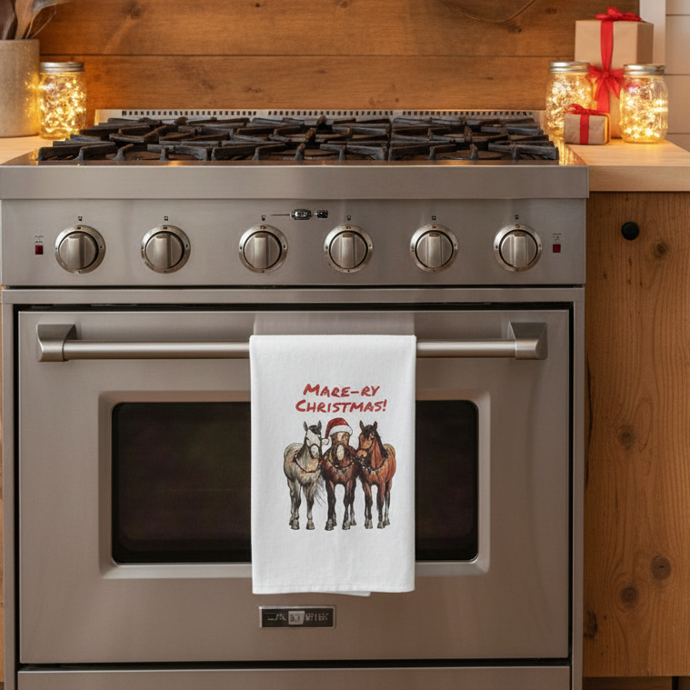 Three festive mares, all garlanded up and ready to bring a little barn-side cheer to your kitchen. Hang it by the stove, drape it over the sink, or fold it cute for holiday photos — this towel brings that warm, cozy, ranch-at-Christmas feeling.