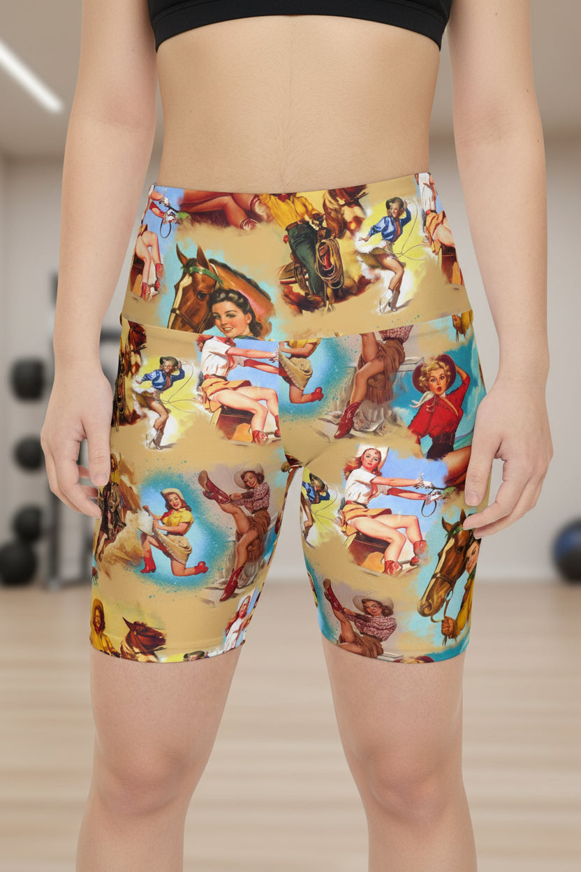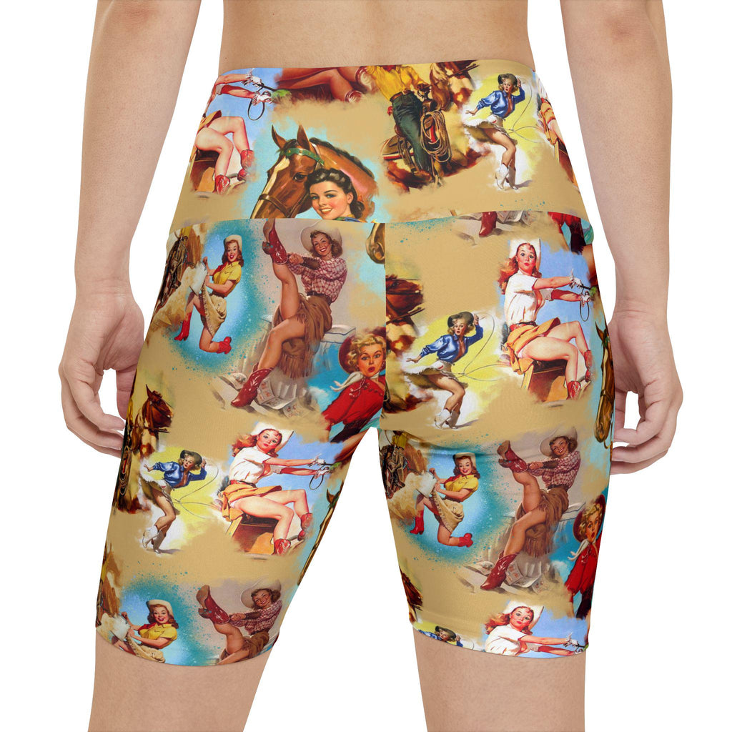 These biker shorts feature our Retro Cowgirl Print â a bold, playful pinup-style Western design filled with flirty riders, vintage cowgirl scenes, and sun-washed desert tones straight out of an old rodeo poster. Designed to move with you, they're just as at home in the gym as they are styled for festivals or everyday wear.