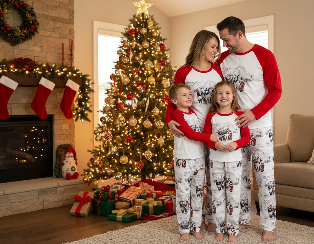 Get ready to sleigh the holidays—Razels style! These exclusive Western Christmas pajamas feature Cowboy Santa steering his horse-drawn sleigh straight into your family’s cozy Christmas photos. With bright red raglan sleeves and cheerful holiday graphics, they’re perfect for starting new traditions or snuggling by the fire.