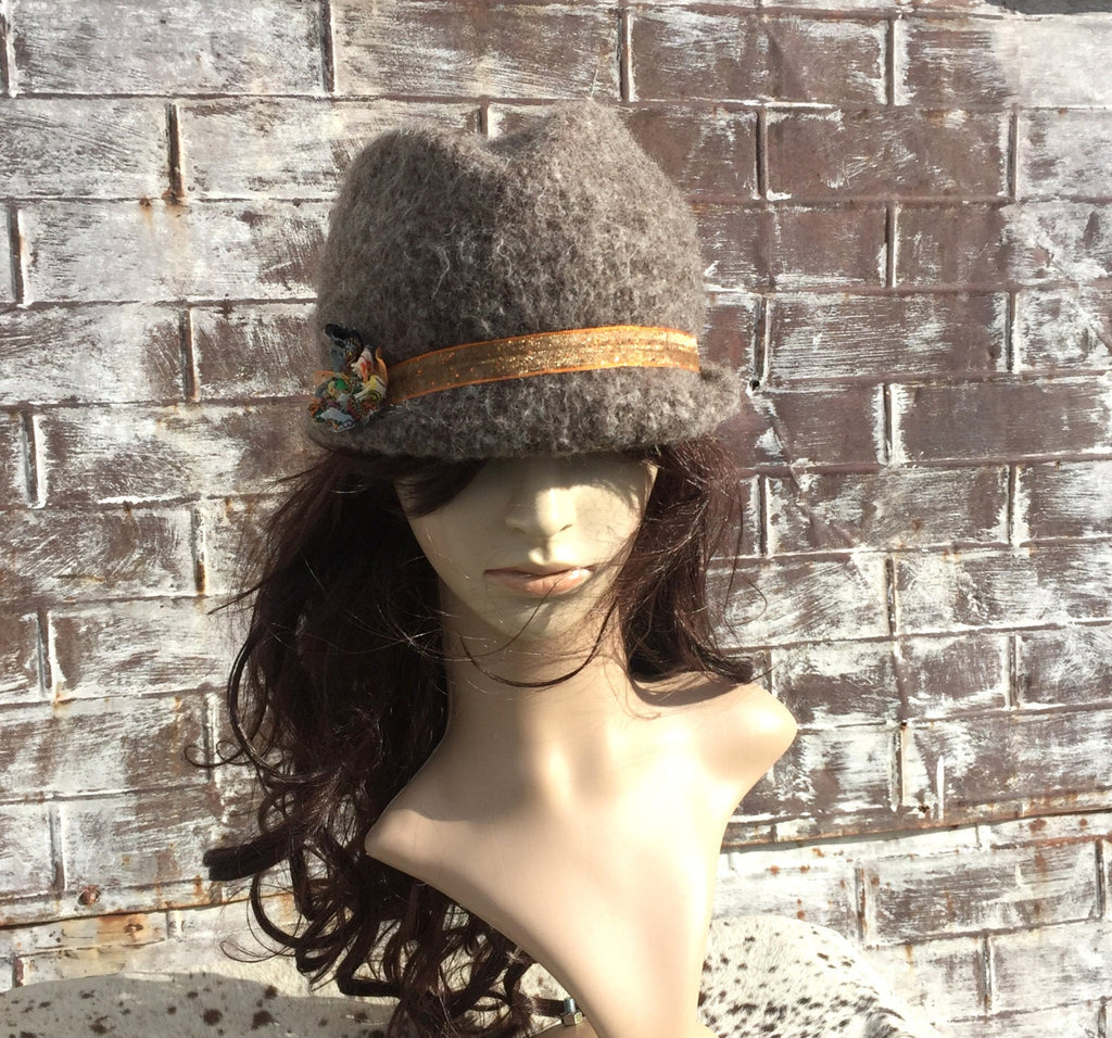 Brown Wool Trilby Hat with Sparkly Orange Band & Multicolor Flower, WOOL FEDORA, WOMENS Handmade Hat