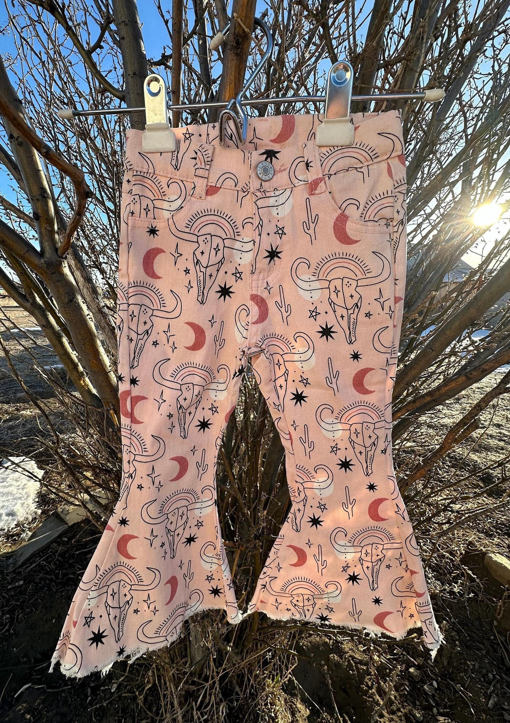 With cow skulls, moons, cactus, stars... oh my! These pink bell bottoms are full of western sass and sweet desert vibes.