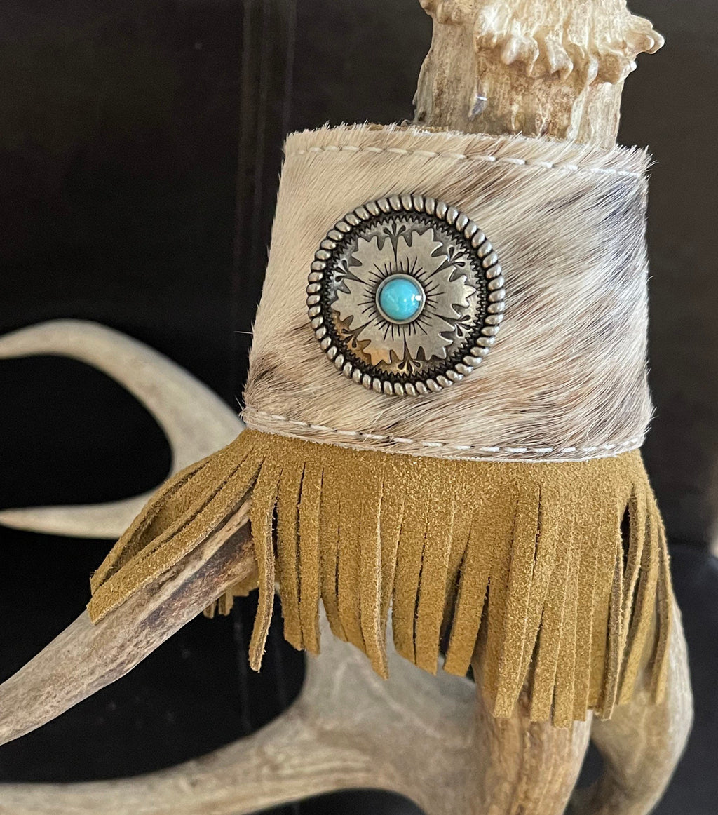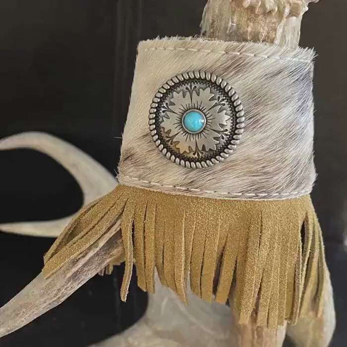 Make a bold statement with this stunning Western cuff bracelet! Crafted from brindle hair-on-hide, this cowhide bracelet features a striking tribal silver concho and eye-catching leather fringe that hangs beautifully under the wrist with its unique diagonal cut.