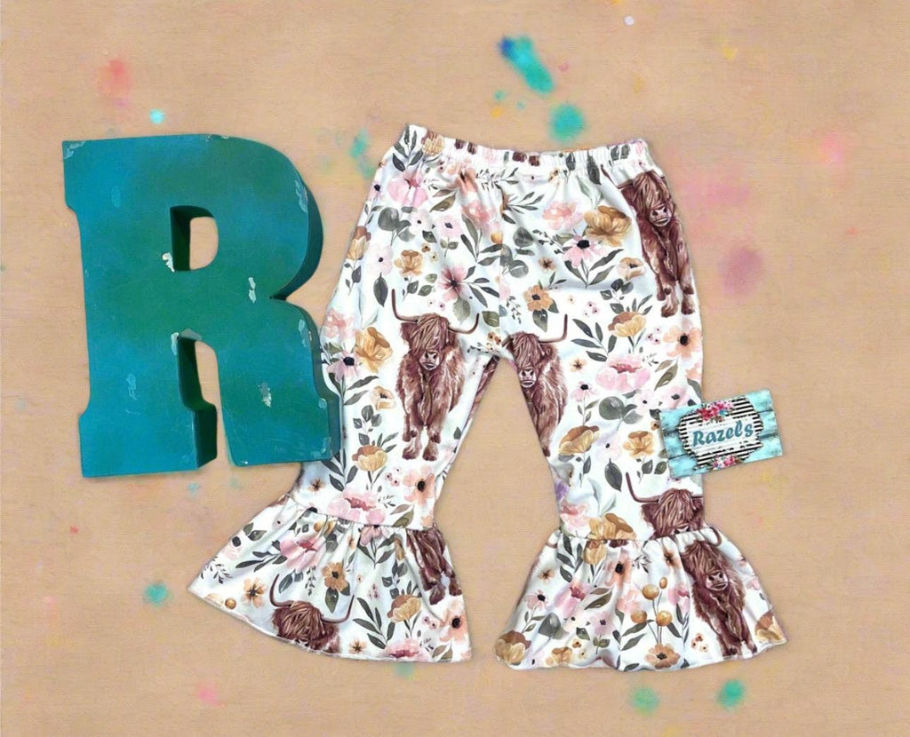 Highland Cow Floral Bell Bottoms – Adorable Western Cow Pants for Little Cowgirls!