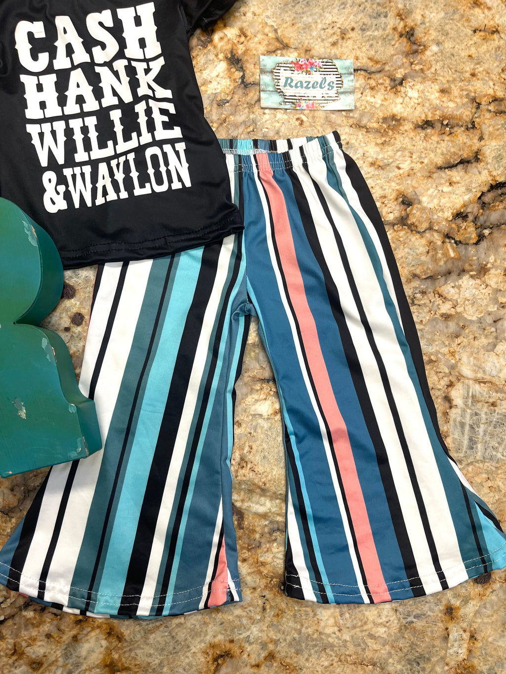 This super fun set features a black tee repping the greats: CASH, HANK, WILLIE & WAYLON—paired with bold, striped bell bottoms that are pure country sass 😍😍 Perfect for fairs, concerts, or just showing off their classic taste in music! 🎸🎶