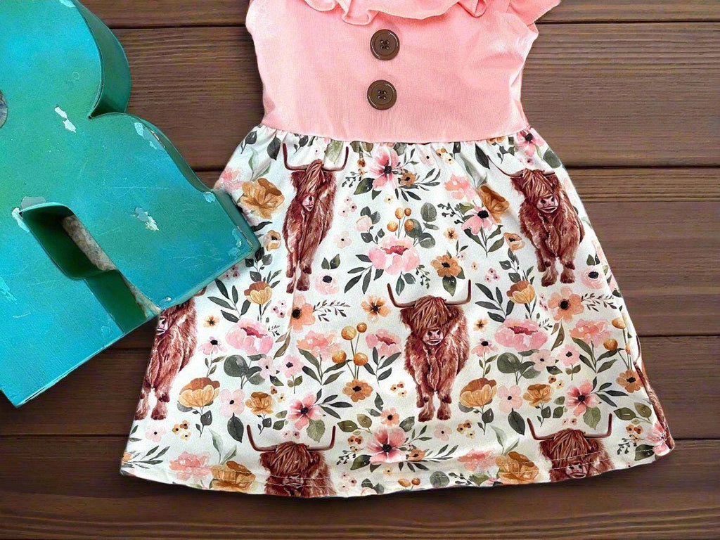 Check out this adorable Scottish Highland Cow Dress! 🐄💖 It's the perfect blend of comfort and style, featuring a cute floral highlander cow print on the bottom. The soft top has flutter sleeves, a collar, and button details for an added touch of charm. Crafted from a soft cotton/spandex blend, this dress offers a true-to-size fit and is machine washable for easy care. 🧺
