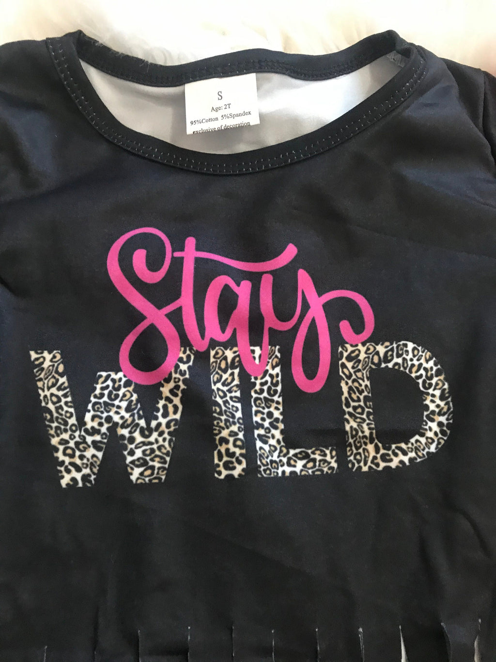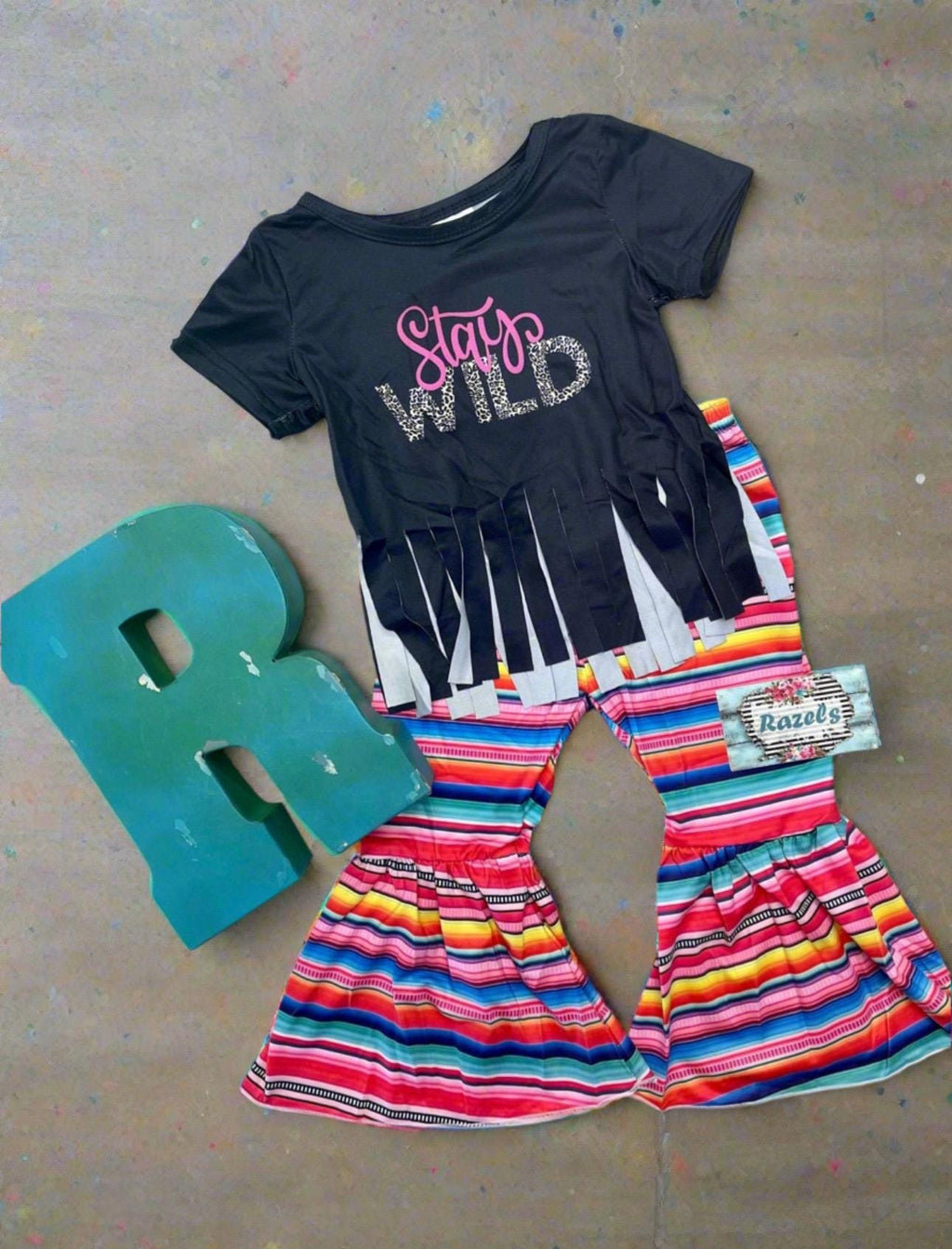 Get ready to turn heads with this stylish Stay Wild Shirt and Serape Bell Bottoms set! The black Fringed Shirt features a bold "Stay Wild" design in pink and cheetah print, perfectly paired with vibrant serape-striped bell bottoms. This outfit is the ultimate statement piece for adventurous little fashionistas!