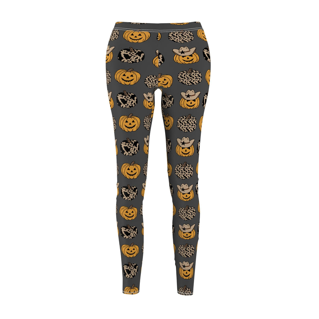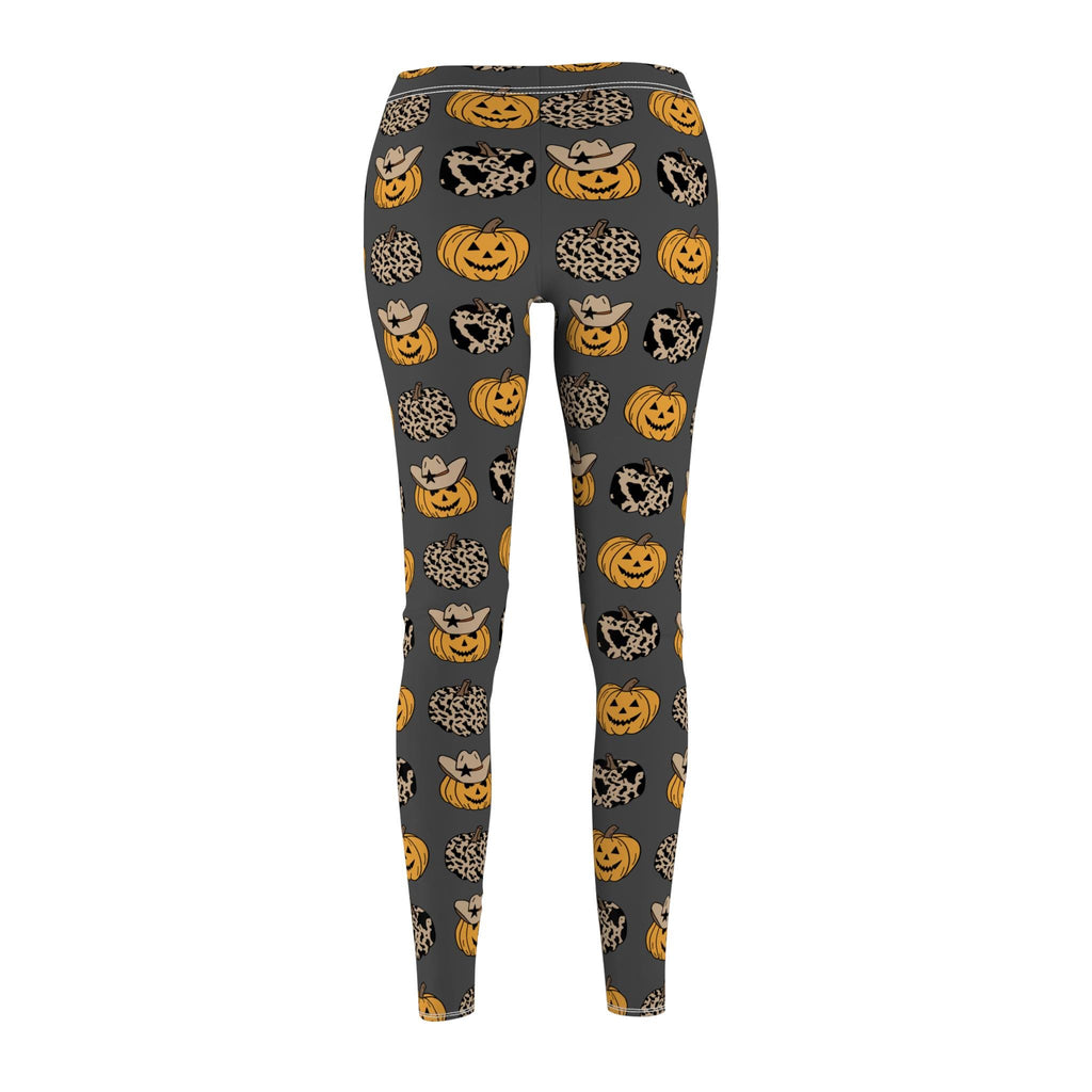 Step up your fall fashion game with these Halloween-themed women’s leggings! Instead of basic black, these cozy charcoal grey leggings are covered in playful cowboy pumpkins, classic jack-o’-lanterns, and animal-print pumpkins for a festive twist that’s perfect for the season.