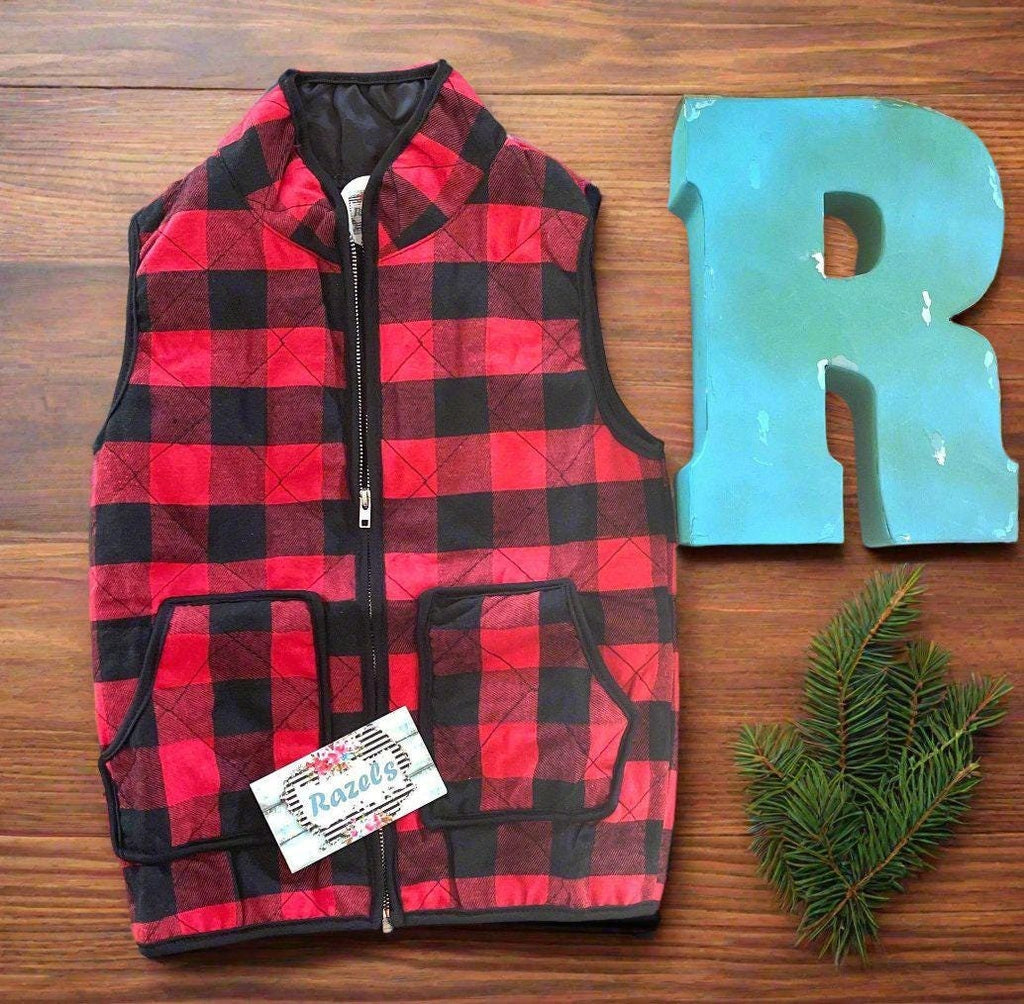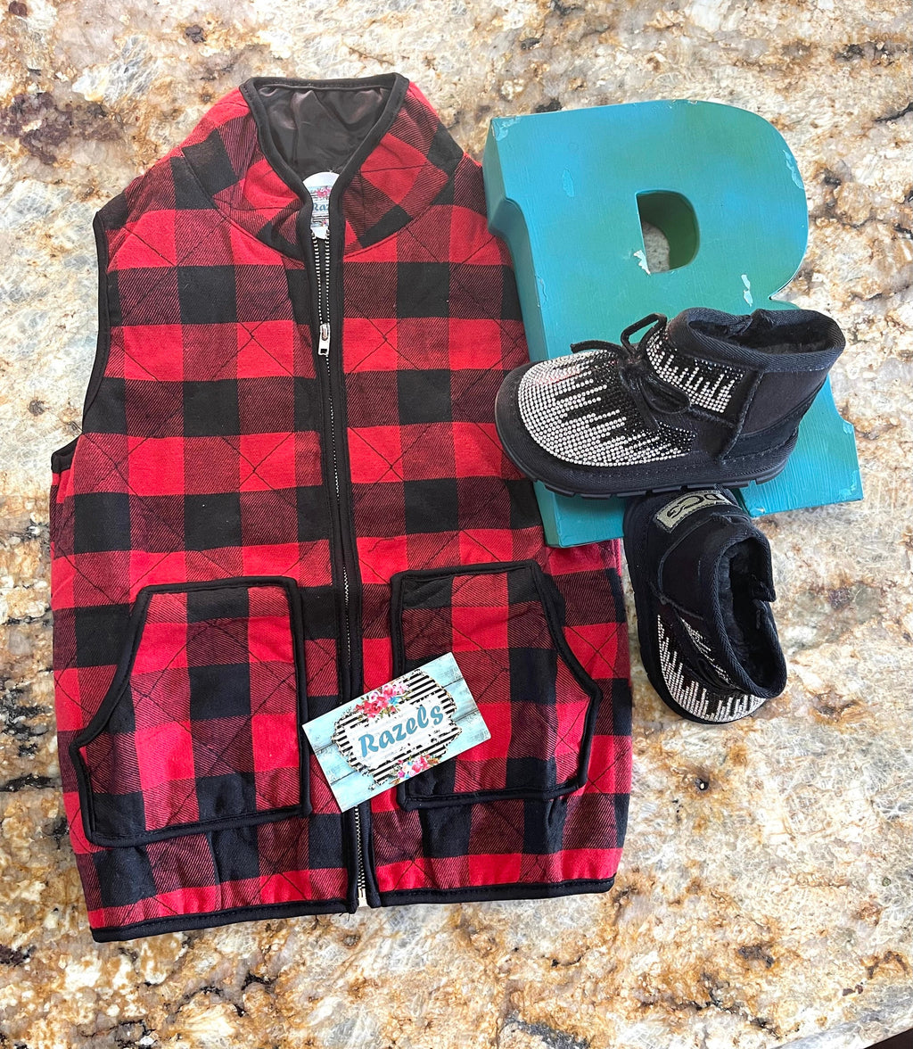 How cute is this vest?! Perfect addition to your little's Fall & Winter wardrobe! A fun, versatile piece for the upcoming Holiday, Christmas Season that adds that extra bit of warmth in the always loved red and black buffalo plaid check! 🎄
