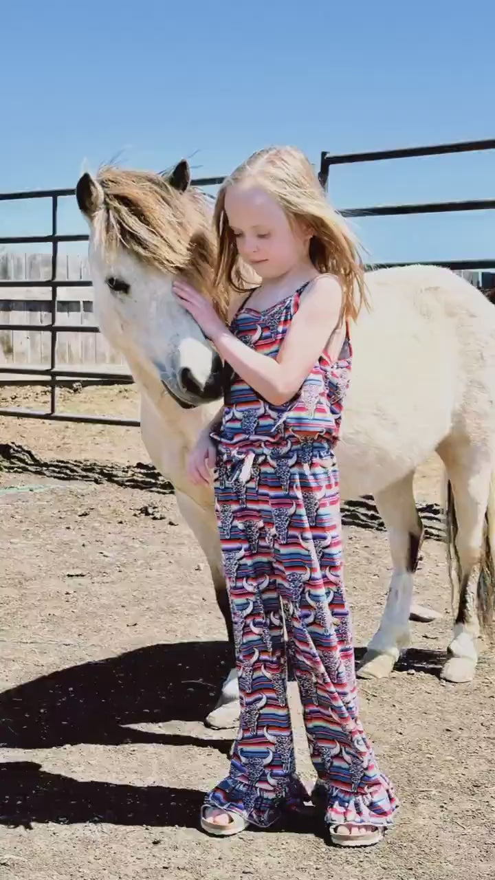 Whether you're dressing her up for playdates or pictures, this blue and serape romper is a must-have for her Spring and Summer wardrobe!
