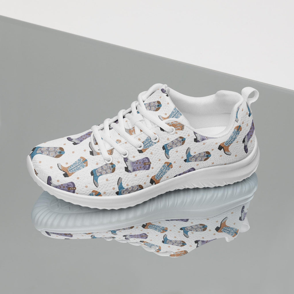 Put a little giddy-up in your step! These lightweight athletic sneakers are covered in a fun and funky cowboy boot print in grey, purple, and turquoiseâbringing Western charm to your everyday hustle. Whether you're on your feet all day or running errands around town, these kicks offer comfort, breathability, and just the right dose of yeehaw energy.