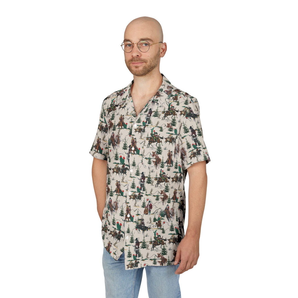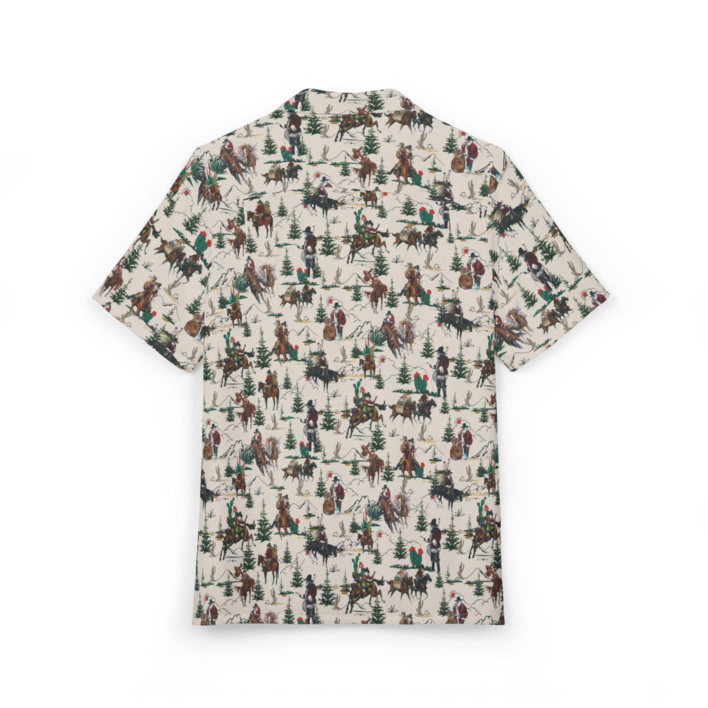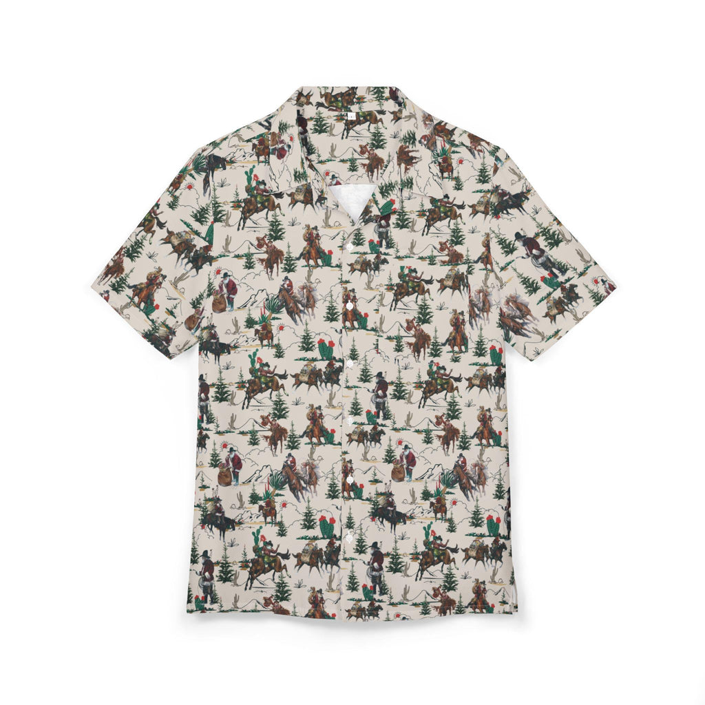 Meet the newest addition to our slow fashion lineup: the Unisex Cowboy Santa Short Sleeve Button-Down Shirt. This vibrant Hawaiian-style shirt takes your favorite holiday cowboy and drops him right into vacation season. Santa’s delivering packages on horseback (with one buckin’ just a little—he’s still a cowboy after all), now reimagined in a tropical, all-season style.