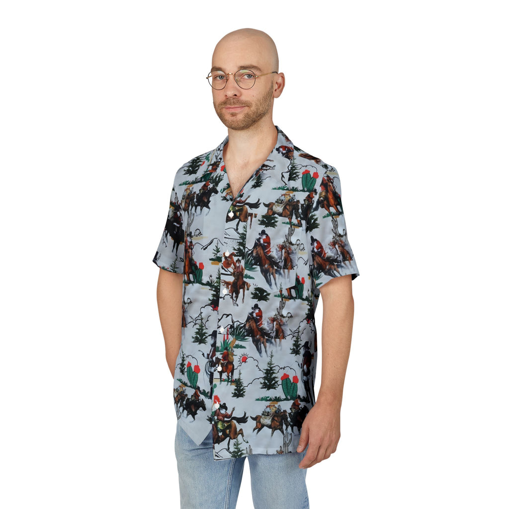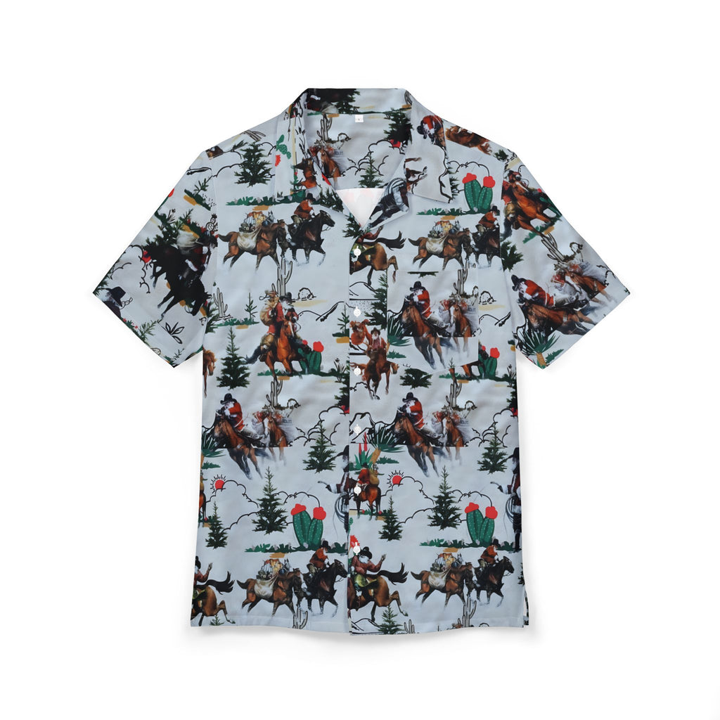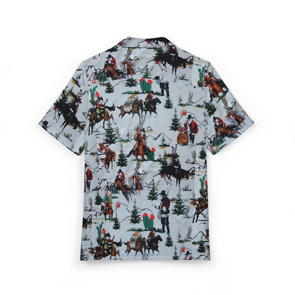 Meet the newest addition to our slow fashion lineup: the Unisex Cowboy Santa Short Sleeve Button-Down Shirt. This vibrant Hawaiian-style shirt takes your favorite holiday cowboy and drops him right into vacation season. Santa’s delivering packages on horseback (with one buckin’ just a little—he’s still a cowboy after all), now reimagined in a tropical, all-season style.