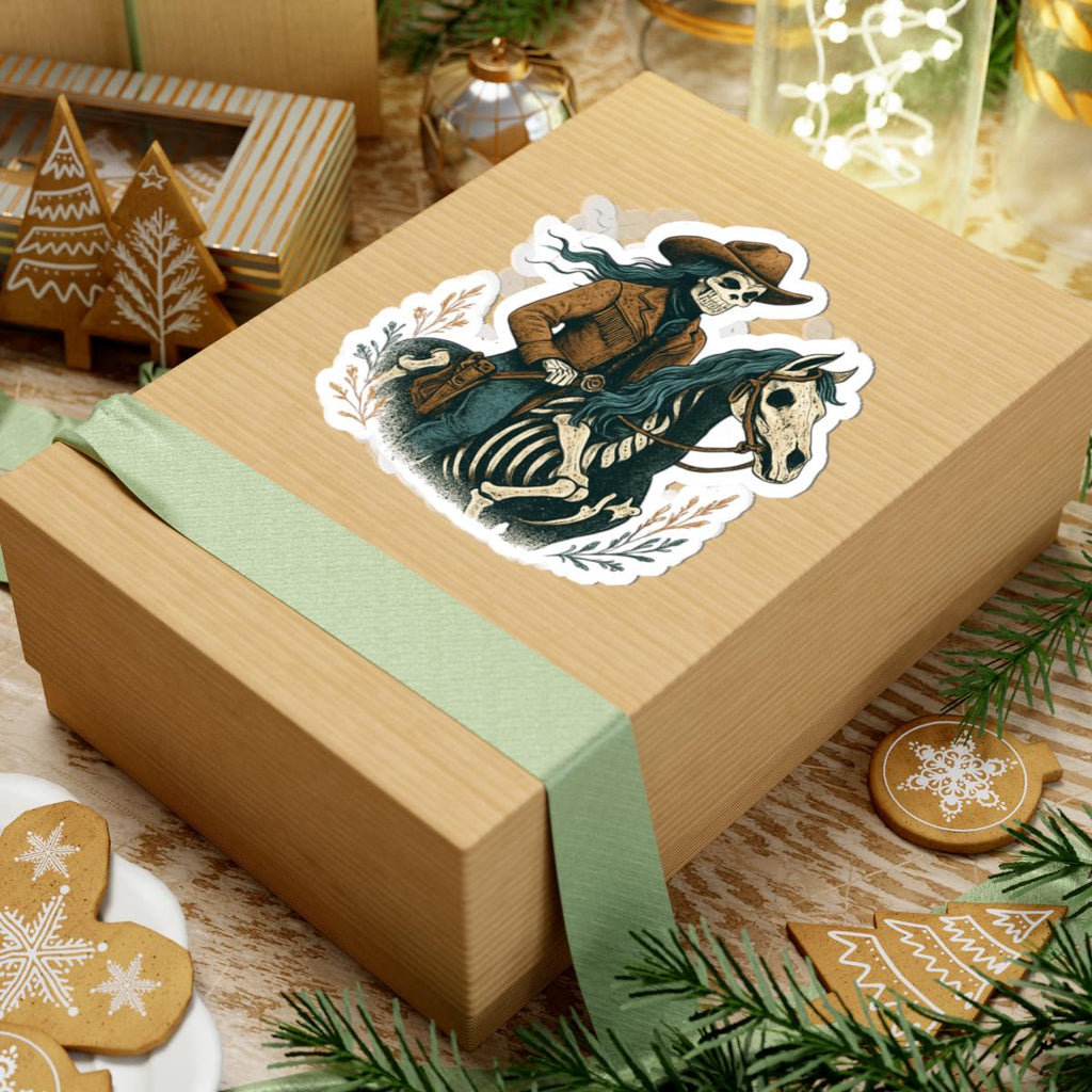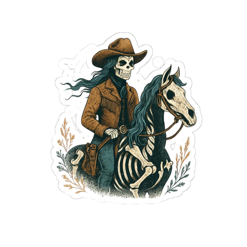 🤠 Cowgirl Skeleton Sticker – Western Halloween Vinyl Kiss Cut Decal | Spooky Cowgirl Riding Horse | Razels Exclusive