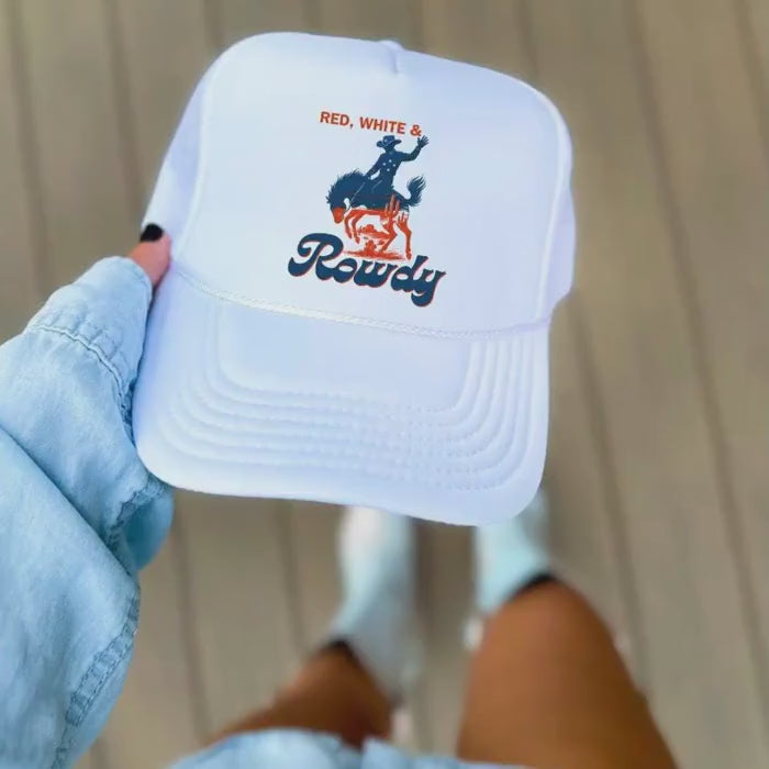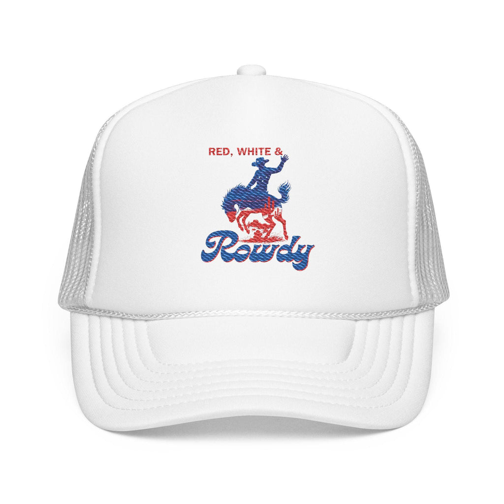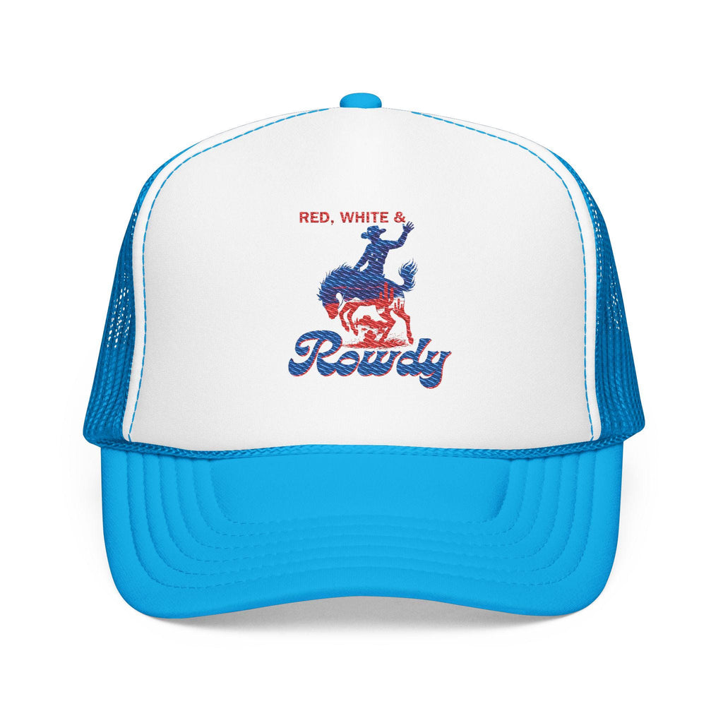 Turn heads with a pop of color and a punch of personality! This Red, White & Rowdy foam trucker hat features the same bold embroidered cowboy + bronc design you love—now available on a playful lineup of fun foam caps in pink, turquoise, white, and black/white combos. Whether you're wrangling your crew for the 4th of July, hitting the rodeo, or just adding flair to your summer outfit, this hat brings the good vibes.