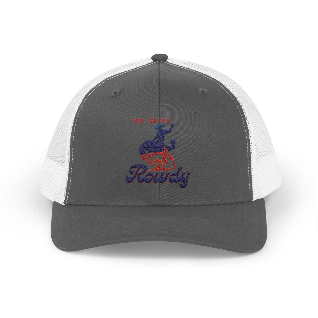 Saddle up and stand out with this bold Red, White & Rowdy embroidered trucker cap! Featuring a striking red and blue cowboy on a bucking broncāwith a desert scene hidden in the silhouetteāthis hat delivers the perfect mix of Western grit and patriotic pride.