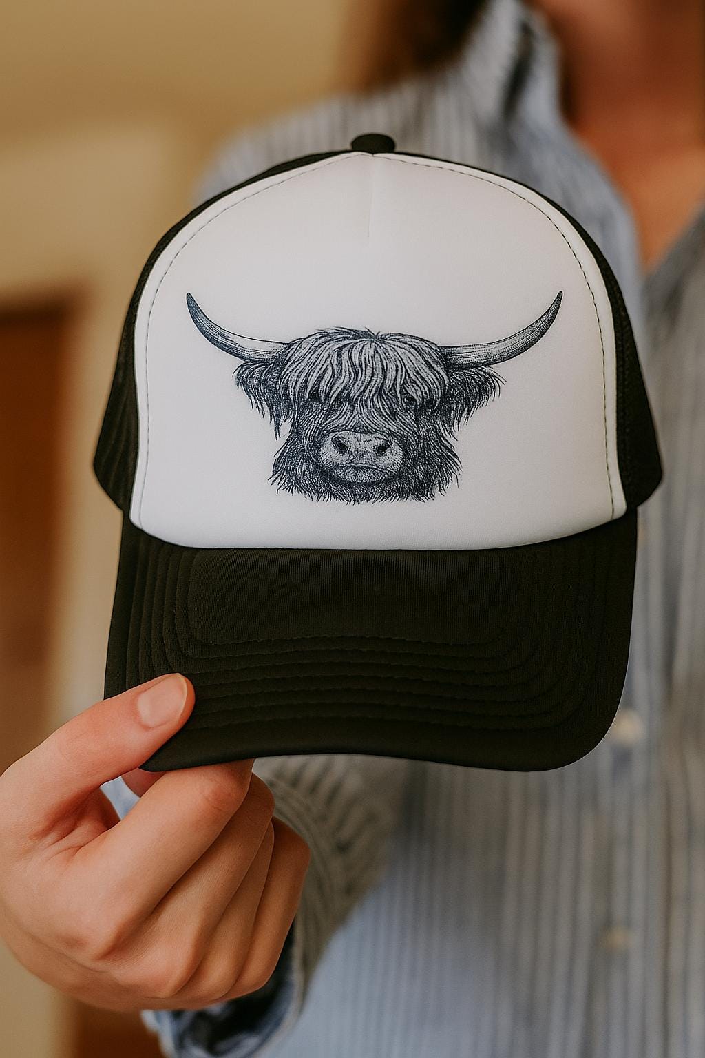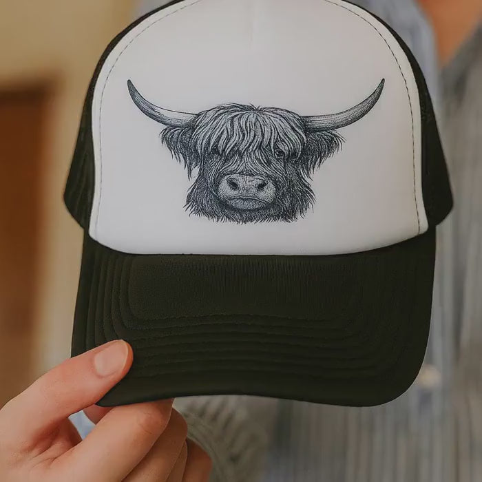 Materials: HIGHLAND COW EMBROIDERED TRUCKER HAT.