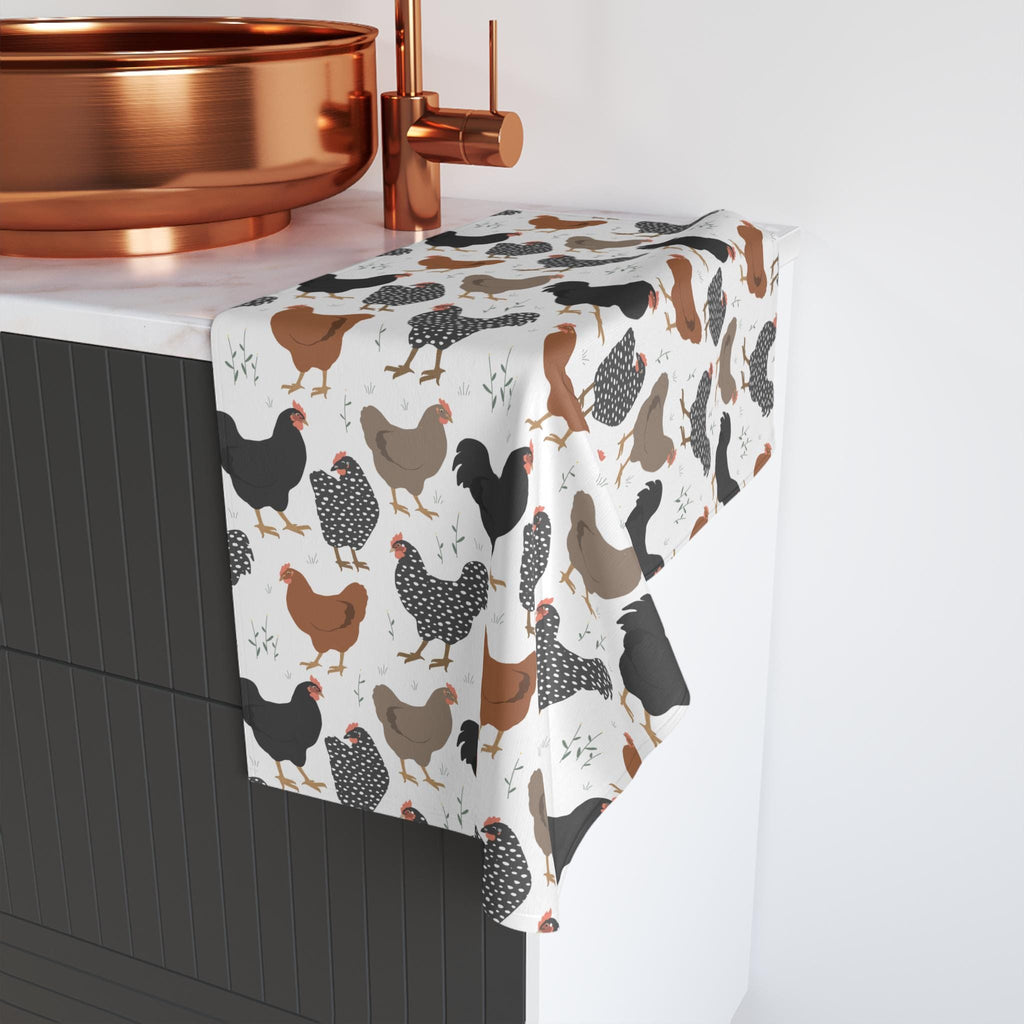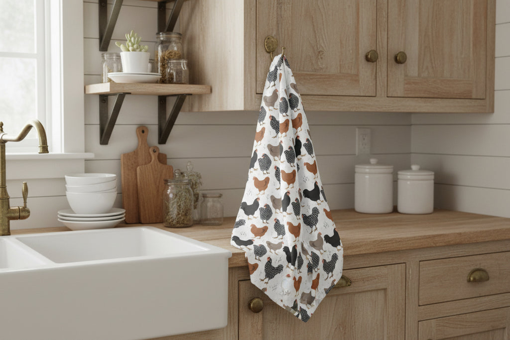 Featuring a repeating pattern of sweet hens in warm neutral tones, this towel is perfect for farmhouse kitchens, country homes, or anyone who loves a cozy, lived-in look.