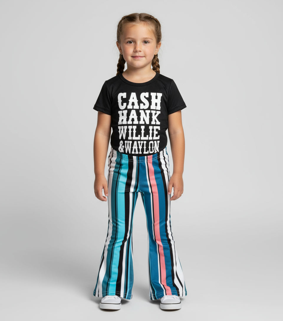 This super fun set features a black tee repping the greats: CASH, HANK, WILLIE & WAYLON—paired with bold, striped bell bottoms that are pure country sass 😍😍 Perfect for fairs, concerts, or just showing off their classic taste in music! 🎸🎶