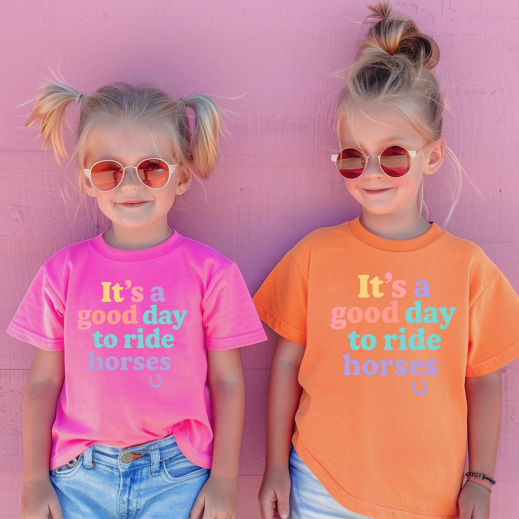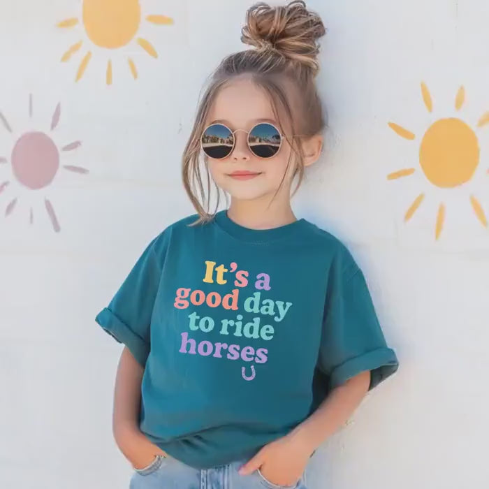 Let your little cowgirl shine with this colorful girls horse tshirt that captures the spirit of freedom and fun! Featuring the cheerful slogan โItโs a Good Day to Ride Horsesโ in bright, playful colors, this t-shirt is made for kids in their Horse Girl Era.