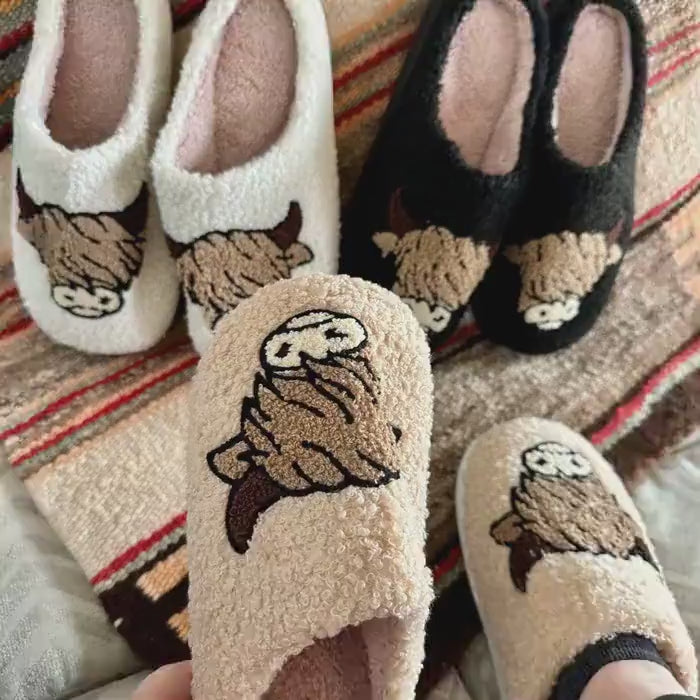 How cute and fun are these Scottish Highland Cow Slippers? Not only are they stylish, but theyâre also unbelievably soft and cozy! Available in tan, black, and white, these are the perfect Cowgirl Slippersâa must-have for any cow lover! Whether you're treating yourself or searching for a Motherâs Day gift, these fuzzy slippers are sure to bring a smile.