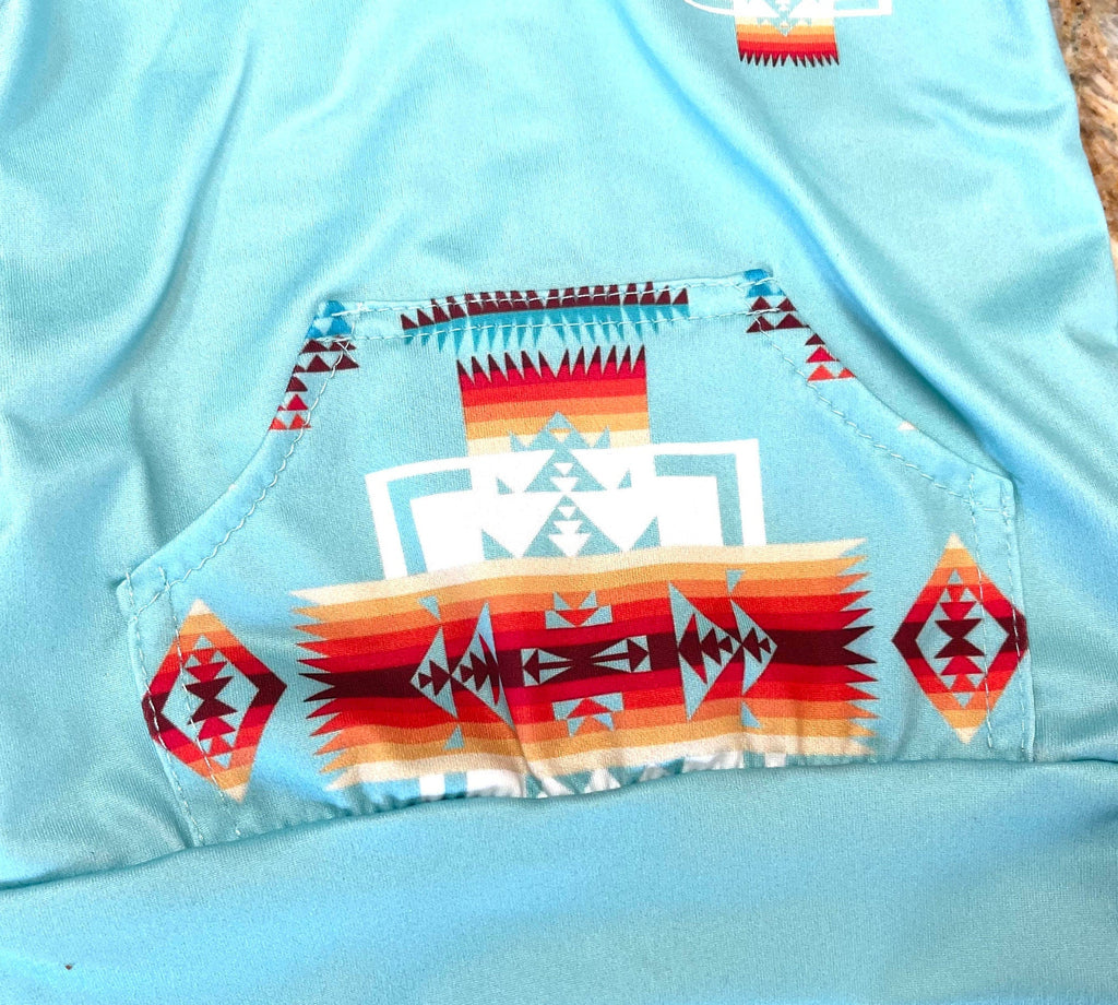 An easy, everyday layer with just enough Western personality. This kids quarter-zip pullover features a soft turquoise body paired with a colorful Southwestern print on the sleeves and kangaroo pocket — bold, fun, and still practical.