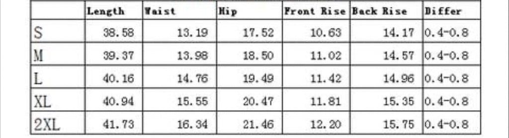2XL – Length 41.73” – Waist 16.34” – Hip 21.46” – Front Rise 12.20” – Back Rise 15.75”