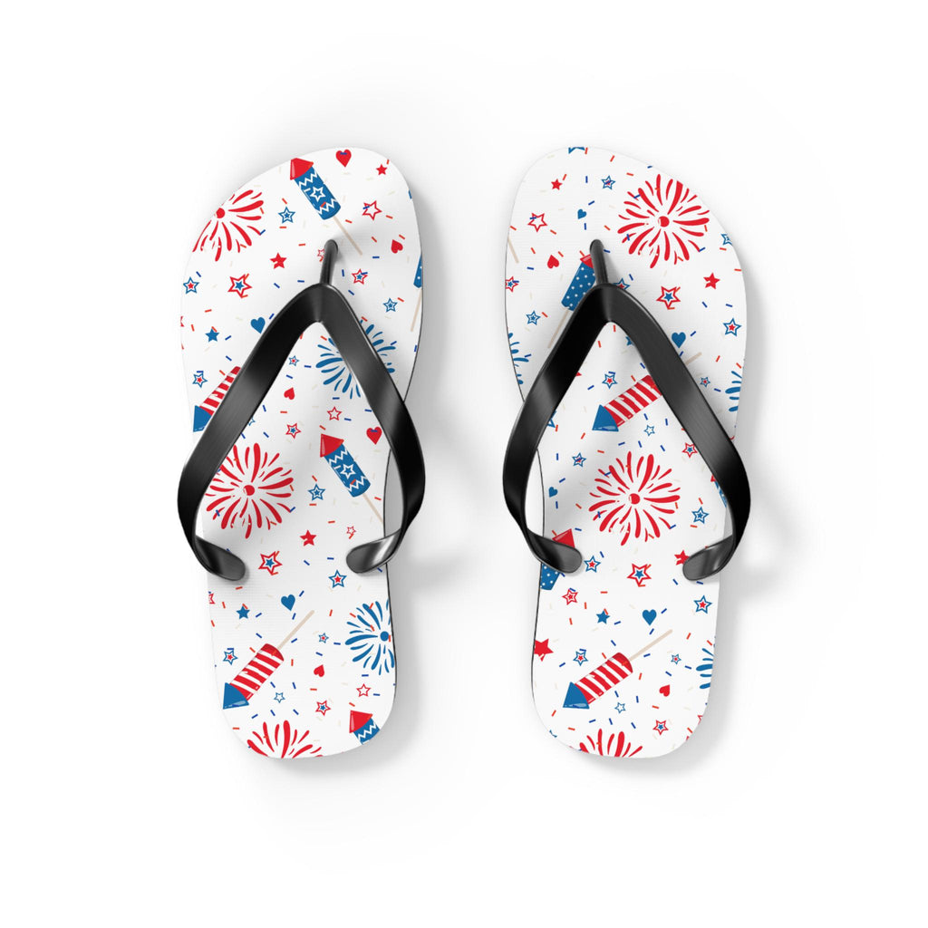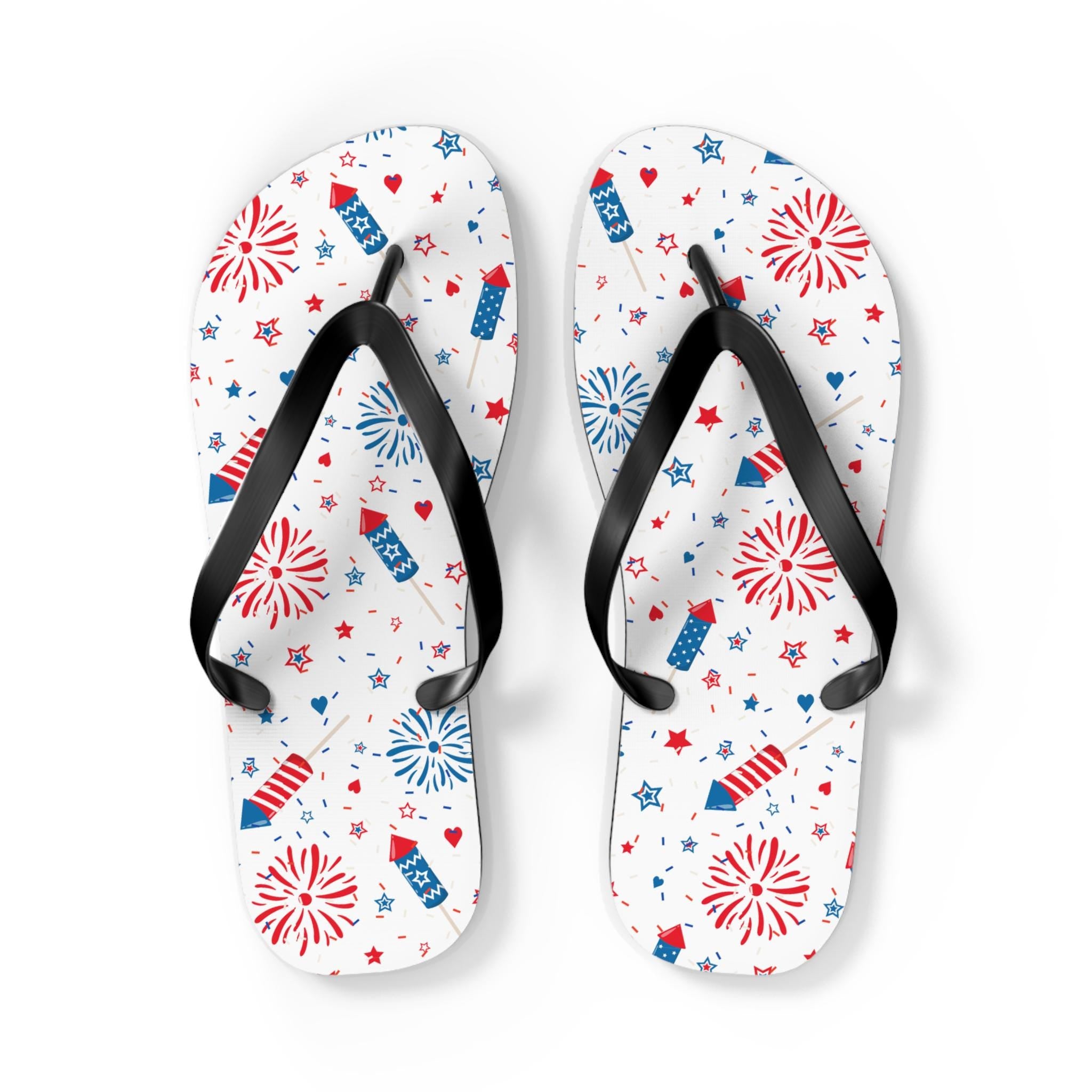 Fireworks, Stars & Hearts July 4th Sandals | Red White & Blue Summer Shoes | Festive Poolside Footwear | American Flag Flip Flops