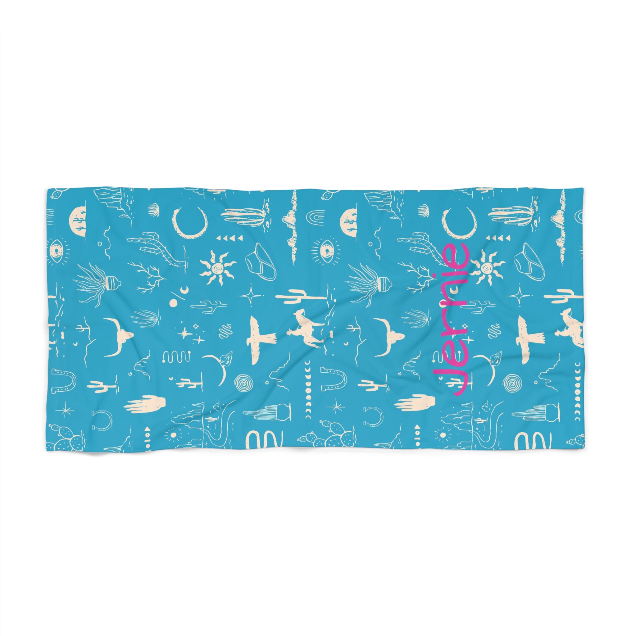 Bring some Western charm to your beach trips or just Cowboy up bathtime with this personalized Cowboy Cowgirl Beach Towel featuring a turquoise Western motif. Perfect for adults who love the Wild West aesthetic, this moisture-absorbent towel is both strong and soft, with hemmed edges for durability. Ideal for summer beach days or as a unique gift for Western enthusiasts.