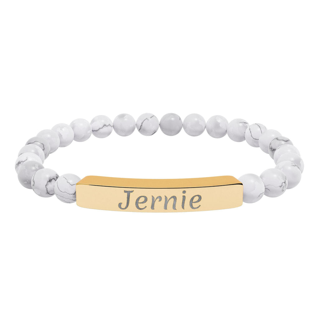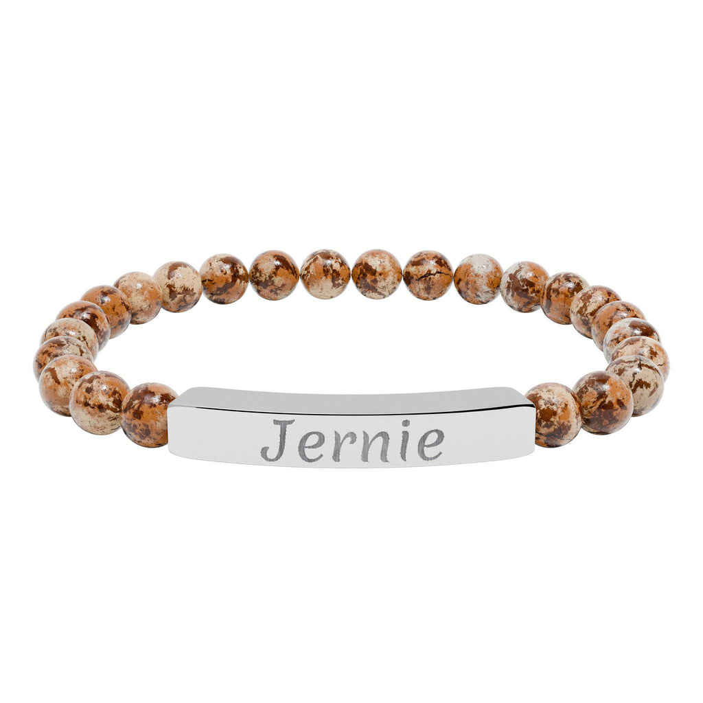 The soft, neutral stones add an earthy, calming feel, while the laser-engraved name plate makes it truly yours. Lightweight and comfortable, this bracelet slips on easily and moves with you from quiet mornings with coffee to evenings out.