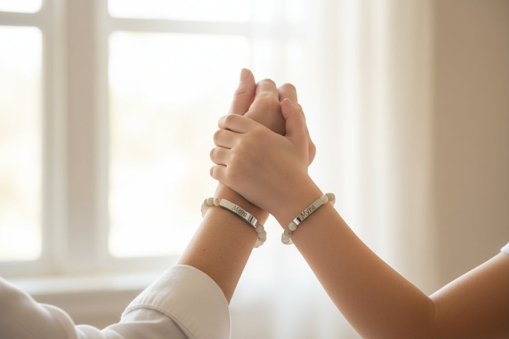 A delicate stretch bracelet that blends natural stone beads with a sleek, engraved stainless steel bar — simple, personal, and made to be worn every day.