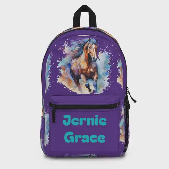 Make back-to-school magical with this one-of-a-kind watercolor horse backpack! Featuring a vibrant splashy horse design and your child's name right on the front pocket, this custom bag is made for young equestrians and animal lovers alike. ๐๐