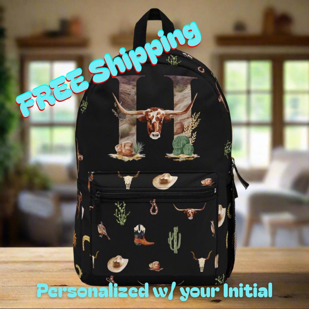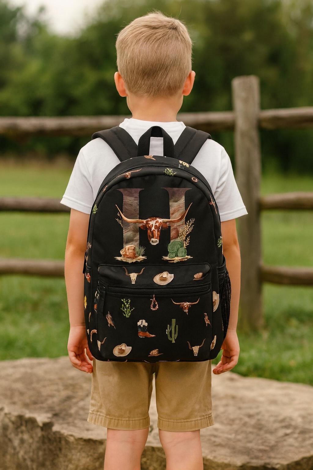 Bring rugged Western style wherever you go with this personalized cowboy backpack. Jet black and covered in boots, skulls, snakes, horses, longhorns, hats, and cacti — your custom initial or name is printed front and center in bold Western font for a one-of-a-kind look.