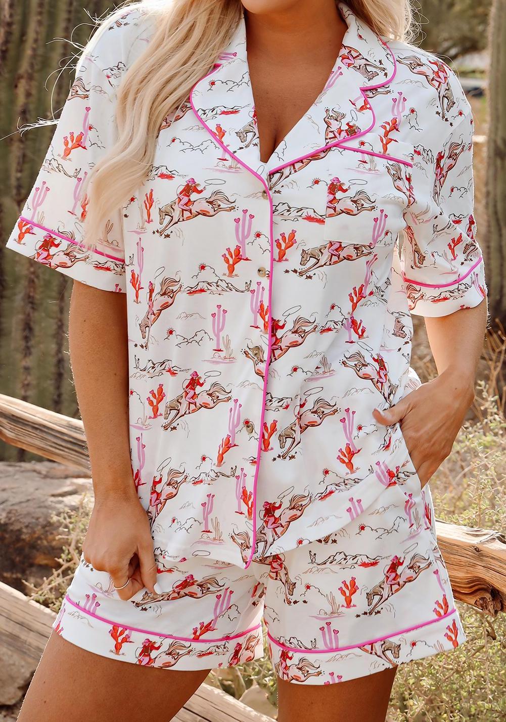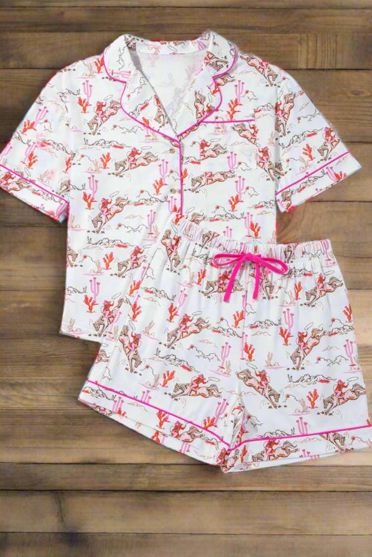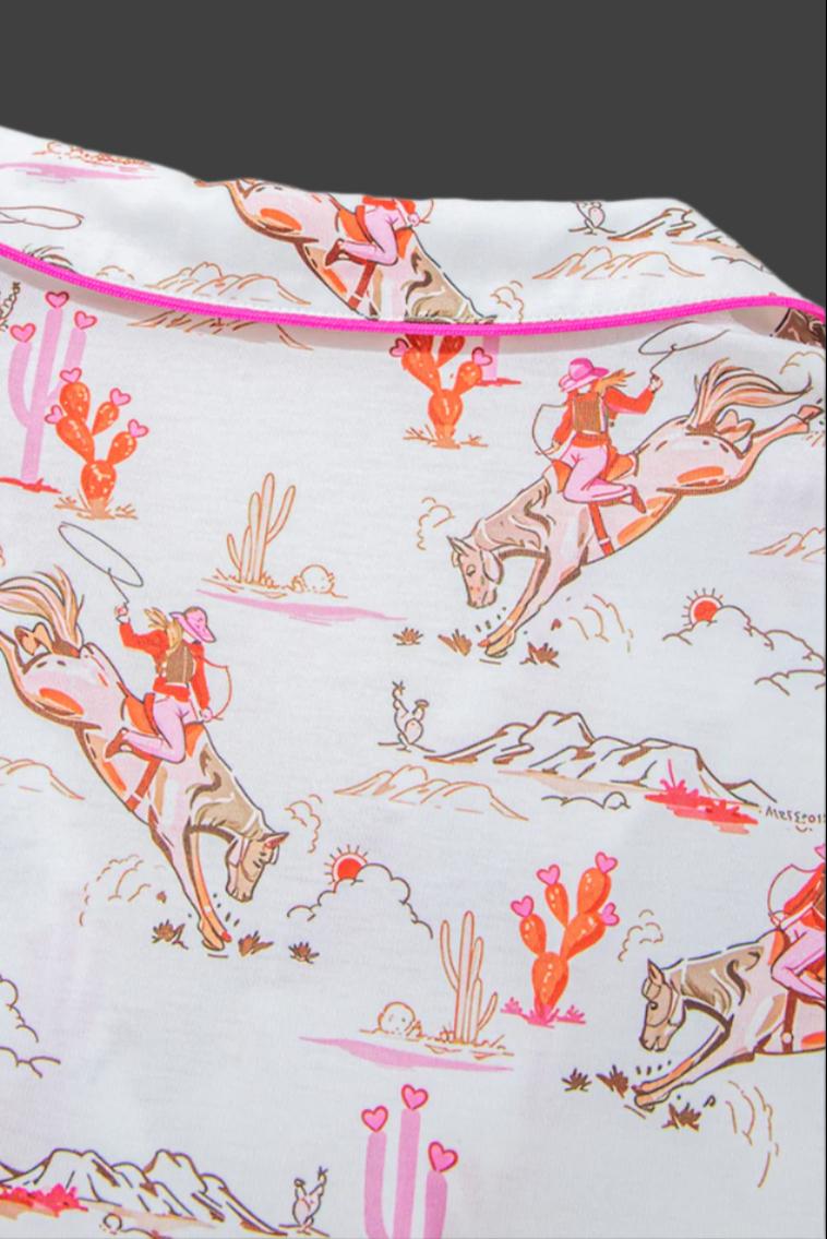 Embrace your inner cowgirl with this adorable pink pajama set, designed for the wild-at-heart who also love their beauty sleep. This western short set is as cozy as it is cuteāperfect for warm summer nights, bachelorette parties, birthday gifts, or just treatinā yourself to some cowgirl charm.