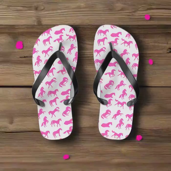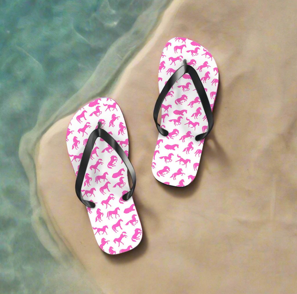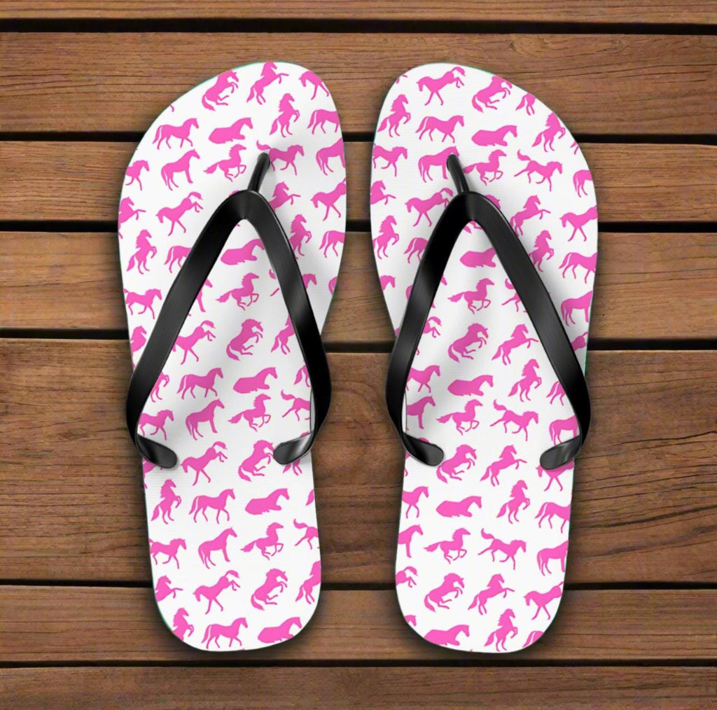 Step into your Pink Pony era with these yeehaw-worthy flip-flops covered in hot pink ponies! Whether you're two-stepping through a summer festival, heading to a bachelorette bash, or just lounging like the rodeo royalty you are, these sandals are here to serve comfort and cowgirl cuteness.