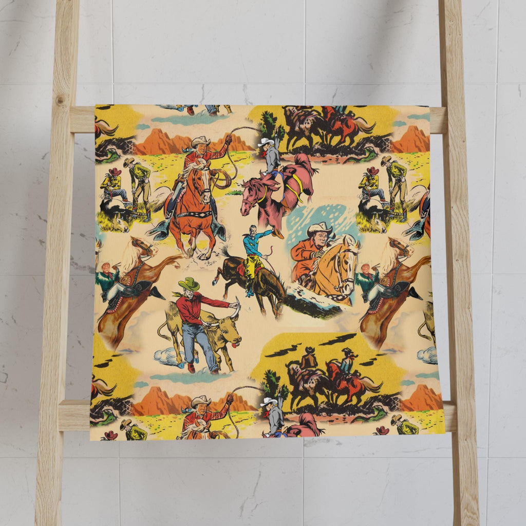 This retro cowboy hand towel features a bold, vintage-style rodeo collage inspired by old-school Western heroes, trusty horses, and golden-age cowboy adventures. The warm desert tones and action-packed scenes bring instant character to your kitchen, bathroom, camper, or ranch home.
