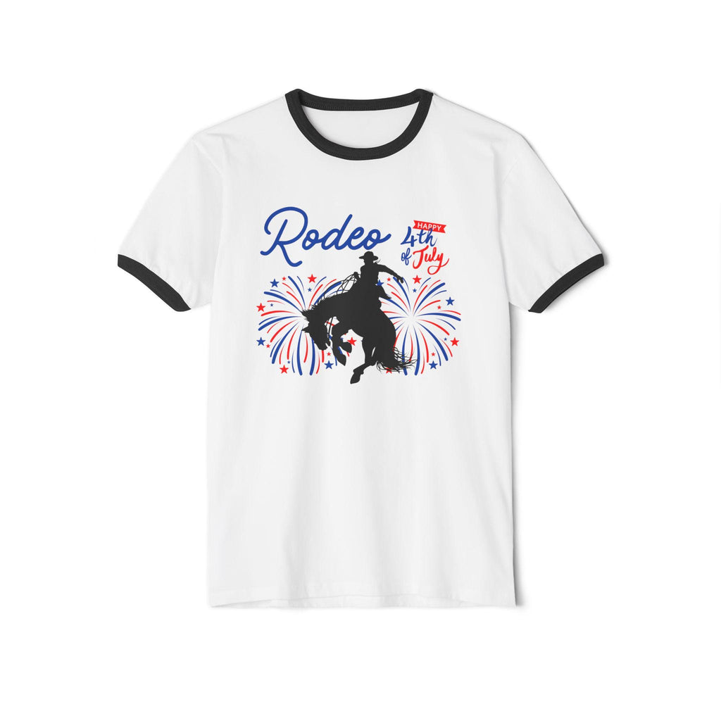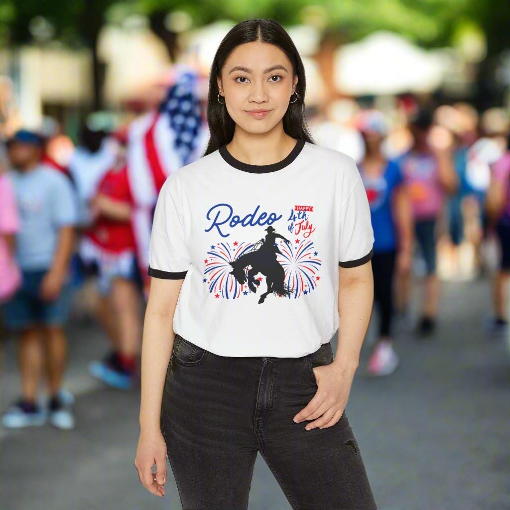 This classic ringer tee brings serious rodeo energy to your Independence Day look. Featuring a cowboy bronc silhouette lit up by red, white, and blue fireworks, plus bold RODEO and Happy 4th of July text—it’s loud, proud, and made for the kind of summer day that ends with fireworks and dust in your boots.