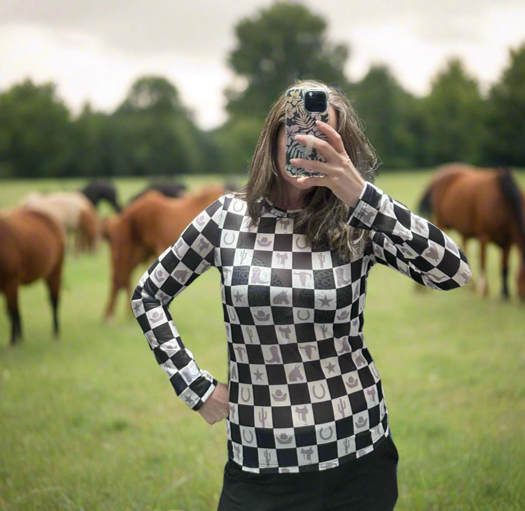 Unleash your inner cowgirl with a bold, modern twist! This Western Motif Shirt is the perfect blend of classic Western charm and edgy contemporary style. Designed for effortless layering, this sheer checkerboard top features an eye-catching mix of cowboy hats, horses, cacti, saddles, boots, steer heads, and more—making it the ultimate cowgirl shirt with attitude.