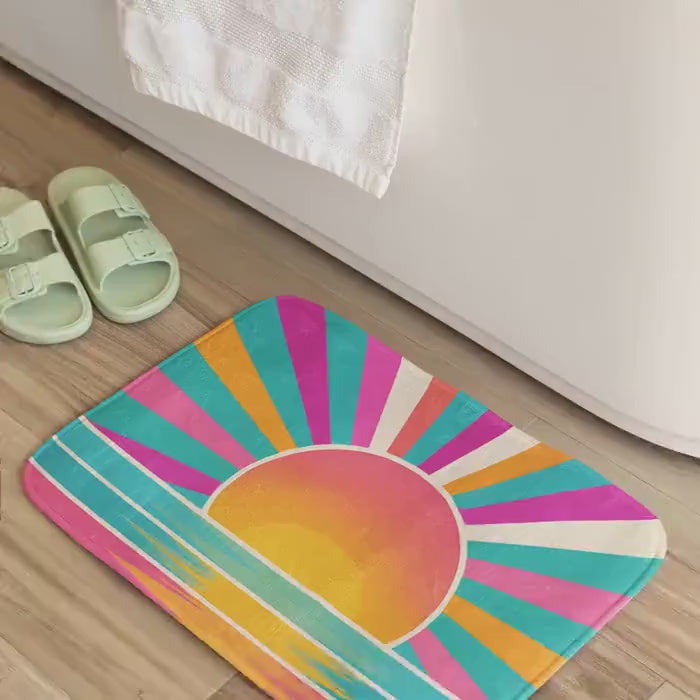 Step out of the shower and into sunshine with this dreamy bath mat! Designed to match our Sunrise Radiance Shower Curtain, this mat features a soft and bright sunrise palette—glowing with turquoise, blush pink, off-white, and golden yellow. The perfect pop of color to brighten any bathroom with youthful, boho flair 🌈🌞