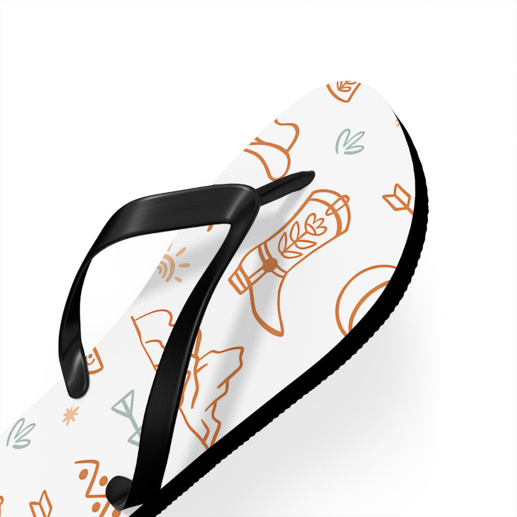 Boots off, flip flops on—these western-inspired beauties are ready to ride shotgun all summer long. With a bold beige and turquoise motif featuring thunderbirds, boots, arrows, and mountains, they’re practically a postcard from the wild west.