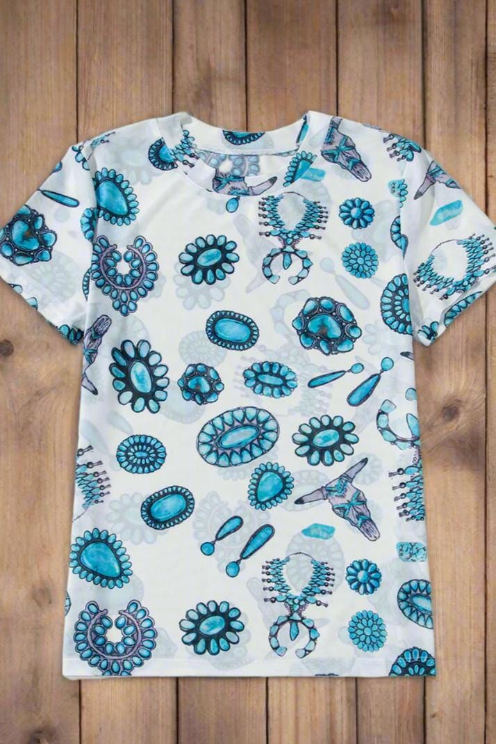 Yeehaw! Saddle up for summer in our Western Mesh Shirt, a cheeky sheer print cowgirl tee adorned with playful cow skulls, vibrant squash blossoms, and charming turquoise conchos—perfect for layering and turning heads at every rodeo or backyard bbq! Don't miss out on this sassy statement piece that lets you ride in style; grab yours now and show off that free spirit! Western Mesh Top - Talk about Western flair with this fun Western Mesh Top featuring cow skulls, squash blossoms, and turquoise conchos!