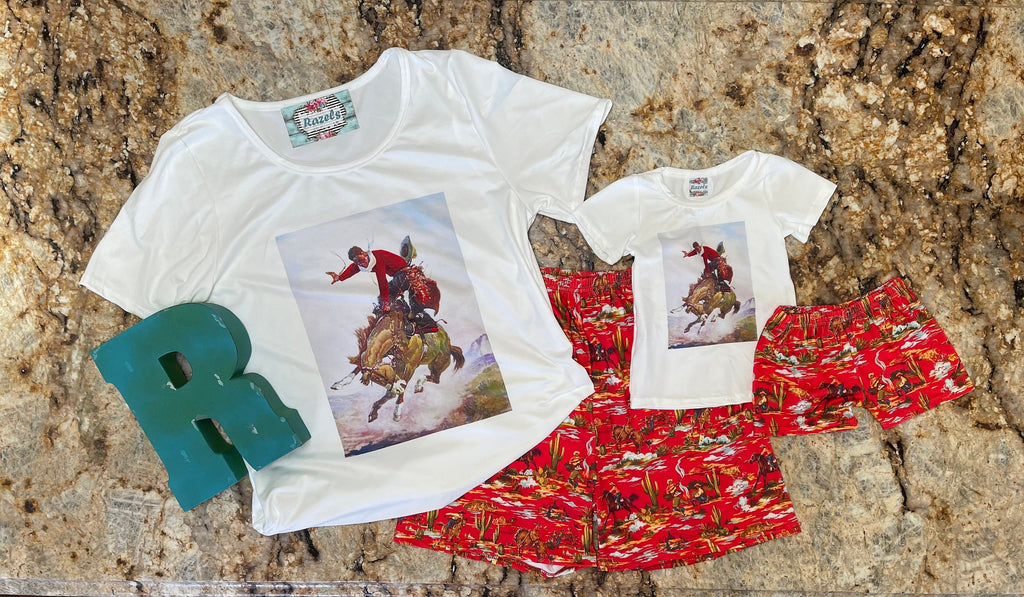 How fun is this Cowboy Shorts & Cowboy T-Shirt set?! đľ This Western Lounge Set is everythingâperfect for lounging, running errands, or styling up for a day out. The vintage cowboy print gives it that classic Western feel, and the shorts? Absolute perfection! đ